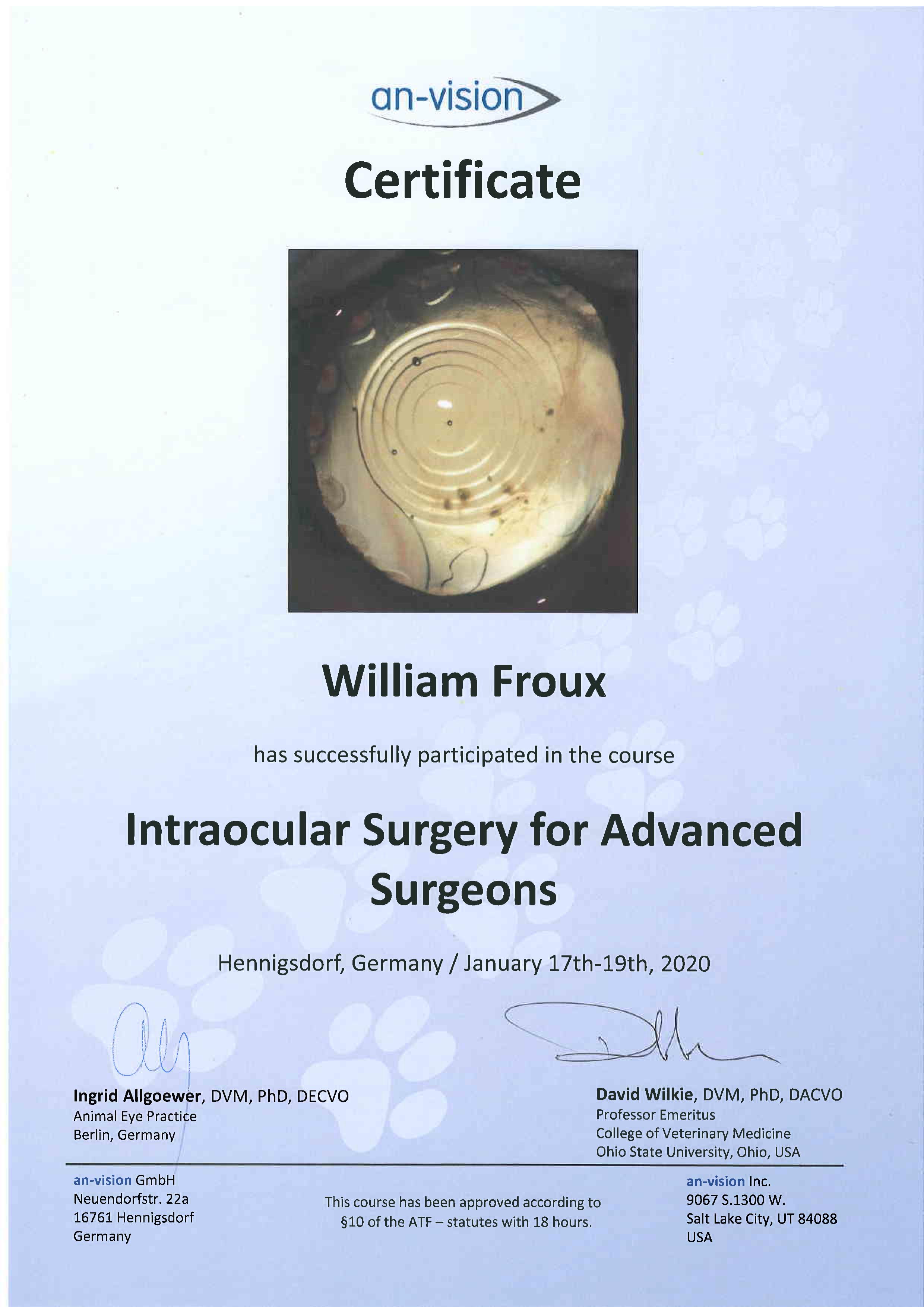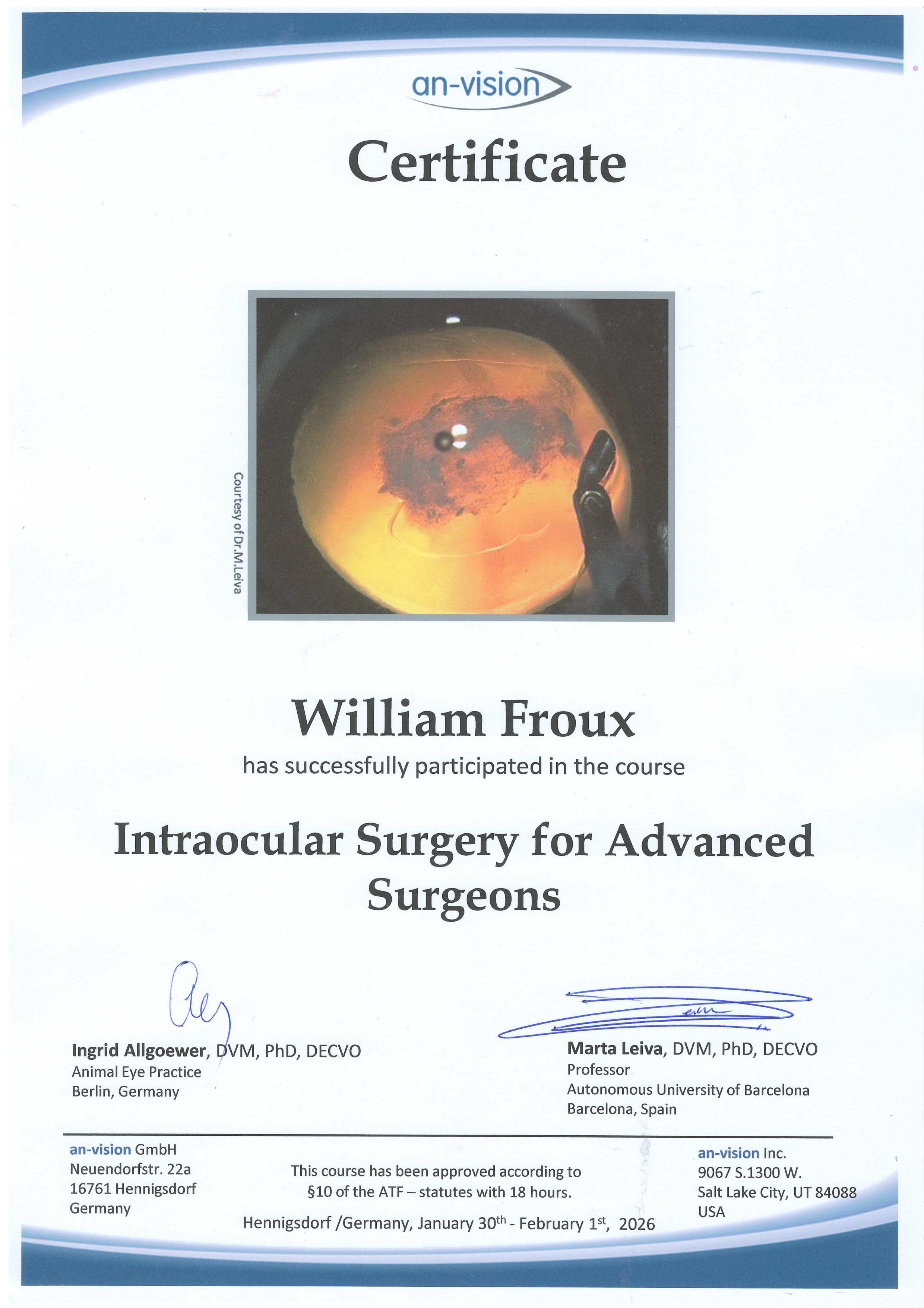 Chirurgie de la cataracte : 800 à 1200€ selon poids de l’animal et implantation